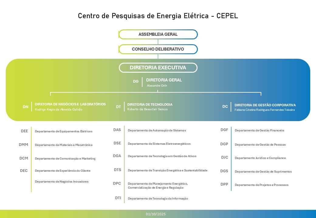 Com vasta experiência em negócios e inovação no grupo Eletrobras, Fabiana Teixeira assume a posição de primeira diretora-geral do Cepel. Atuou por 18 anos em Furnas Centrais Elétricas, onde seu último cargo foi Superintendente de Estudos de Mercado e Inovações, além disso coordenou a área de inteligência de mercado, responsável pela análise da conjuntura econômica do setor de energia e novas tecnologias. Em 2022, Fabiana integrou o Conselho Deliberativo do Cepel, e junto a ANEEL coordenou mais de 30 projetos de P&D.