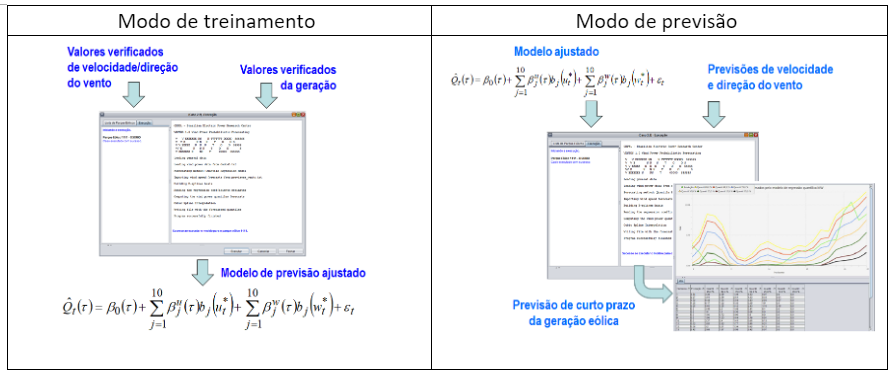 No modo de treinamento, os dados históricos da geração eólica verificada, acompanhados dos valores verificados de velocidade e direção do vento, são utilizados com a finalidade de ajustar um modelo de regressão quantílica, especificado como um modelo aditivo generalizado, no qual a geração é explicada pela velocidade e direção do vento. O modelo é ajustado separadamente para diferentes quantis τ, por exemplo, τ∈{5%, 10%, 25%, 50%, 75%, 90%, 95%}. Ao final, tem-se um conjunto de equações que informam as estimativas dos quantis da geração eólica em função da velocidade e da direção do vento. Adicionalmente, no ajuste dos modelos, pode-se considerar o histórico das previsões anemométricas no lugar do histórico das medições anemométricas.