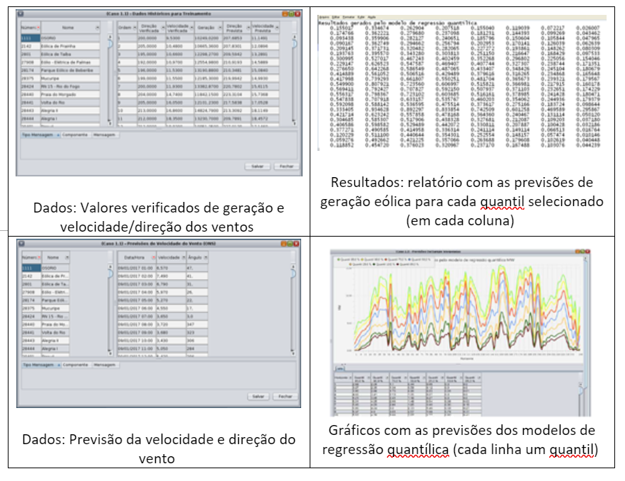 No modo de previsão, as estimativas de velocidade e direção do vento fornecidas por modelos NWP (Numerical Weather Prediction) são importadas pelo programa e introduzidas nas equações previamente estimadas para que sejam calculadas as previsões dos quantis que caracterizam a distribuição de probabilidade da geração eólica. O programa VENTOS também fornece previsões pontuais (medianas) da geração eólica em arquivo no formato do modelo DESSEM usado na otimização da programação diária da operação.