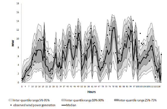 Para lidar com o comportamento intermitente do vento e com a incerteza nas previsões anemométricas, o programa VENTOS fornece previsões da distribuição de probabilidade da geração eólica para cada hora/semi-hora do horizonte de previsão.