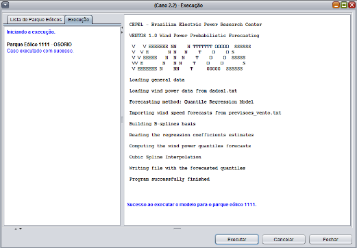 O notável incremento da participação da geração elétrica de origem eólica verificado nos últimos anos é altamente positivo para a matriz energética. No entanto, dado o comportamento intermitente dos ventos, é necessário que a operação energética conte com programas computacionais capazes de fornecer previsões de curto prazo da geração eólica. O programa VENTOS fornece previsões probabilísticas da produção de empreendimentos eólicos, em um horizonte de até uma semana com discretização horária. A previsão é feita a partir de dados característicos das turbinas eólicas e do histórico de dados de vento/geração eólica disponíveis para os aproveitamentos.