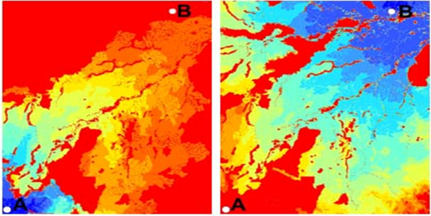 Utiliza-se a função CostDistance sobre a superfície de atrito gerada para produzir superfícies que apresentam, por pixel, o menor somatório de atritos entre um determinado ponto (A,B, etc..) e qualquer ponto da superfície. Nas figuras abaixo, a escala de atrito varia do azul (menor) para o vermelho (maior).
