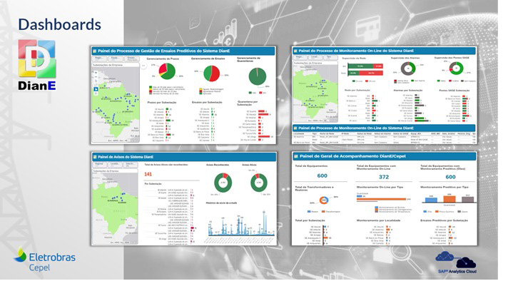 A partir de conexões via SAP, o DianE apresenta painéis com o objetivo de dar suporte a decisões gerenciais, estratégicas e operacionais no que diz respeito à gestão da manutenção de ativos de transmissão e geração. O SAP Analytics Cloud (SAC) de demonstração do Sistema DianE pode ser acessado por qualquer usuário do Cepel e das empresas Eletrobras através do endereço https://eletrobras-1.br10.hcs.cloud.sap/link/diane-demo, sendo necessário utilizar seu próprio login de rede corporativa (domínio\login) e senha de rede.