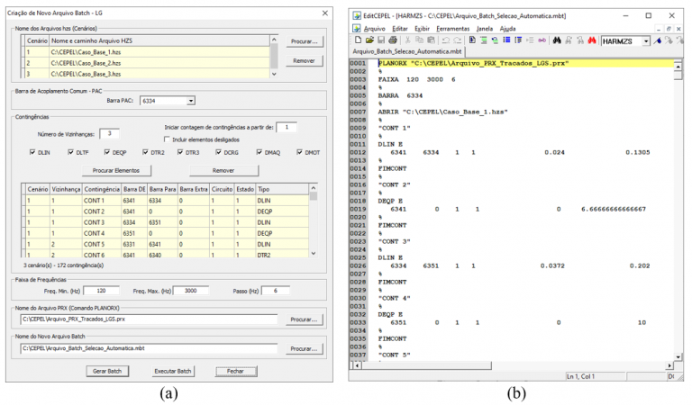 Figura 3 – Interface que automatiza a seleção de contingências (a) e a geração do respectivo arquivo “batch” (b)