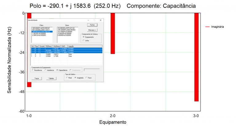 Além dos estudos de acesso, o HarmZs também pode ser utilizado para realizar a análise modal de redes elétricas. Esta análise propicia a obtenção de um conjunto de informações estruturais sobre o sistema que é difícil de ser obtido por outros métodos convencionais, como a simulação no tempo ou resposta em frequência. Estas informações compreendem os polos (frequências de ressonância paralela), zeros (frequências de ressonância série) e as sensibilidades destes polos (Figura 7) e zeros em relação aos elementos do sistema. Estas sensibilidades podem ser efetivamente utilizadas em soluções não convencionais de mitigação de distorções harmônicas, indicando quais elementos e quais alterações nos valores de seus parâmetros devem ser realizadas. Em geral, os elementos da rede elétrica mais fáceis de modificar seus parâmetros e que apresentam valores significativos de sensibilidades são os bancos de capacitores. Exemplos destas soluções, utilizando sensibilidades de polos e zeros em relação aos bancos de capacitores da rede elétrica, estão detalhadamente descritas em [7] e [8], respectivamente.