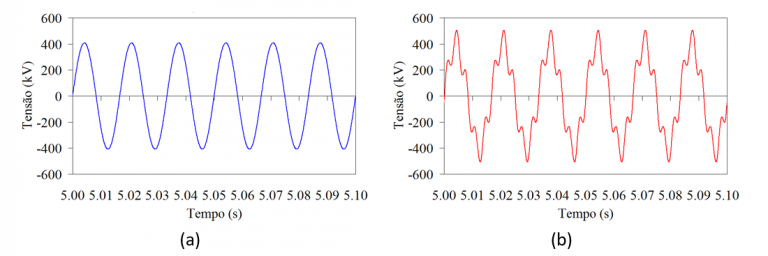 Idealmente, as formas de ondas de tensão que alimentam os componentes do sistema devem ser senoides puras (ver Figura 1 (a)). Os harmônicos, provenientes de uma forma de onda distorcida (ver Figura 1 (b)), aumentam as perdas, modificam o comportamento desejado da operação e reduzem a vida útil dos componentes elétricos (projetados para operar com tensão senoidal) alimentados pelo sistema.