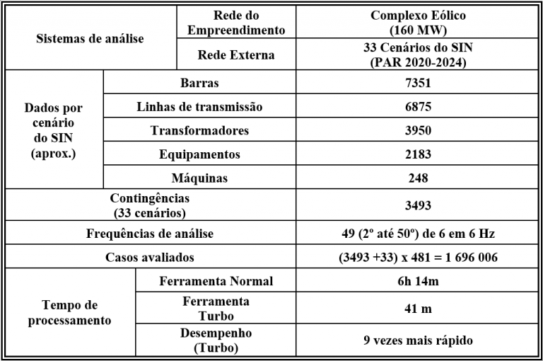 Na Tabela 1 é apresentada a dimensão de um estudo típico de acesso de um Complexo Eólico à Rede Básica do SIN. A partir dela, pode-se ter uma ideia da dificuldade que se teria para executar este estudo sem as ferramentas adequadas para lidar com esta quantidade enorme de informações.
