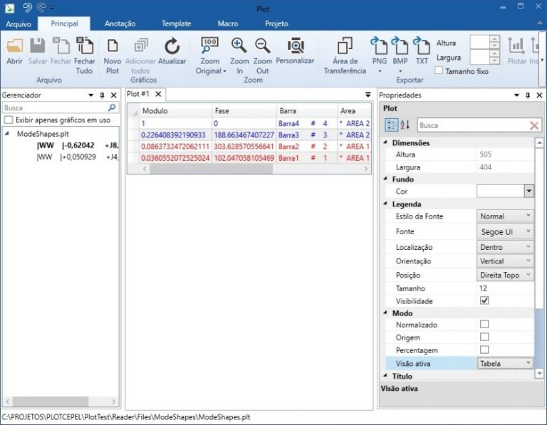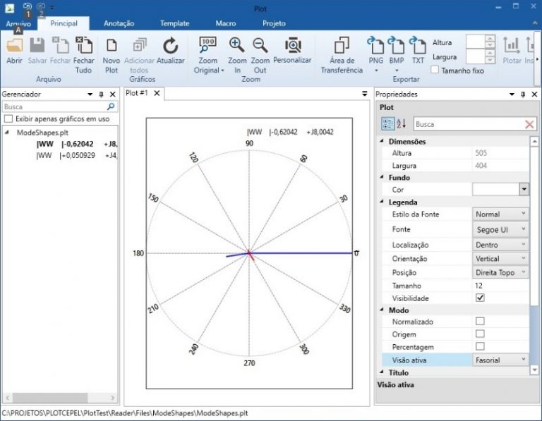 - Gráficos fasoriais apresentam as magnitudes e os ângulos dos mode shapes de modos de oscilação do sistema.