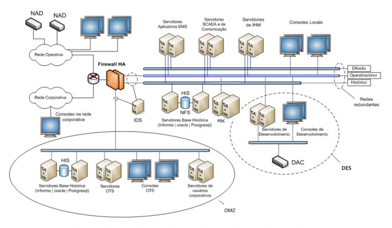 Na Figura 2 são representadas consoles de operação (Windows ou Linux) e servidores SCADA e de comunicação de dados, Análise de Redes, IHM (Interface Homem-Máquina) e Histórico. Esta configuração é apenas ilustrativa, uma vez que estas funções podem ser executadas em qualquer máquina da rede de tempo real. Consoles remotas também podem ter acesso seguro ao ambiente de tempo real.